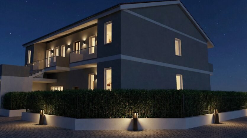 In particolare, qui proponiamo un appartamento di cinque locali al piano terreno di circa 135 metri quadrati commerciali con giardino ad uso esclusivo e portico privato che saranno l’estensione esterna della casa. Internamente si compone di un grande ingresso living su soggiorno con cucina a vista, tre camere da letto e doppi servizi. Completa la proprietà un locale cantina.