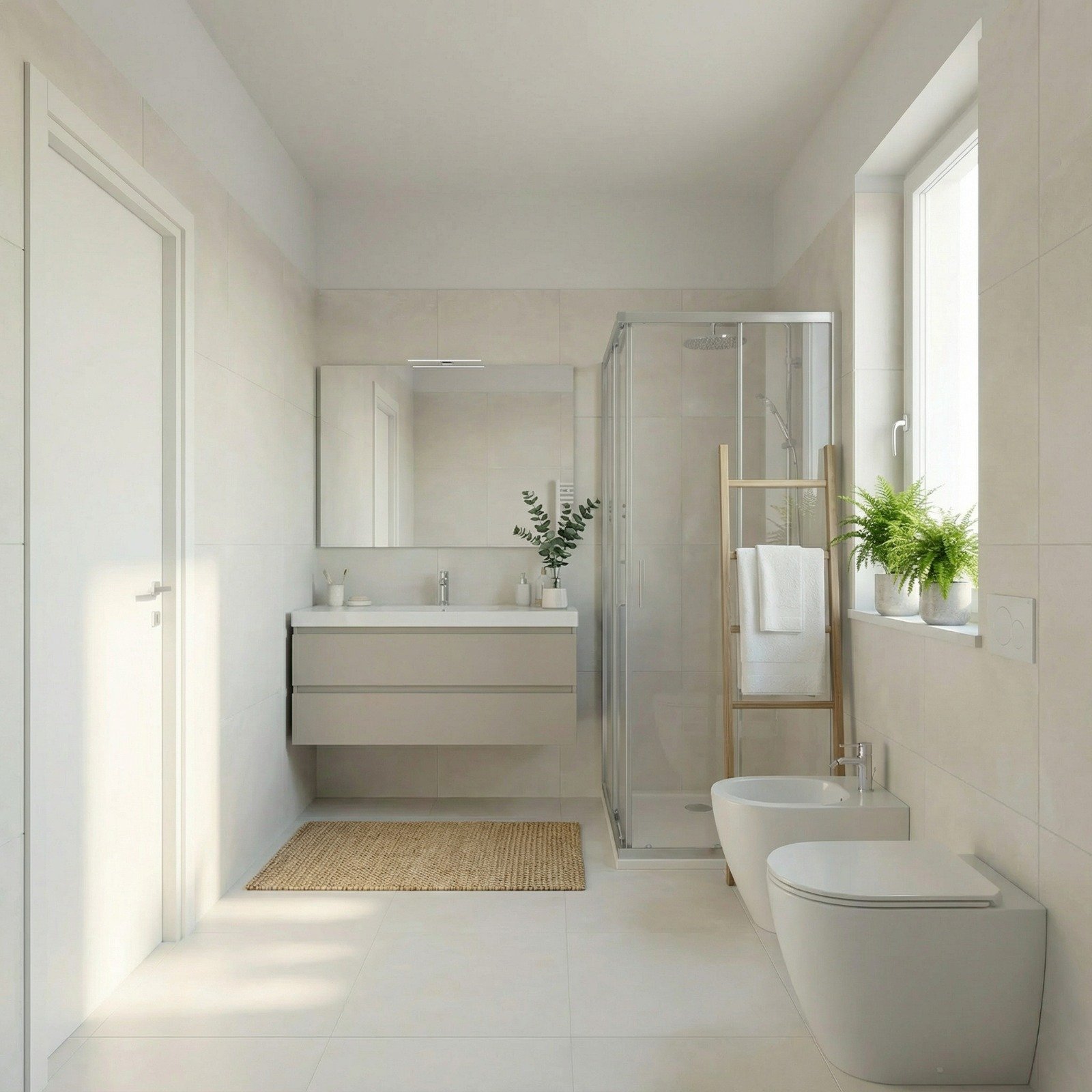 collettori di distribuzione. Piatto doccia in resina e/o vasca in materiale acrilico bianco, box doccia in cristallo, sanitari sospesi, rubinetterie cromate monocomando.