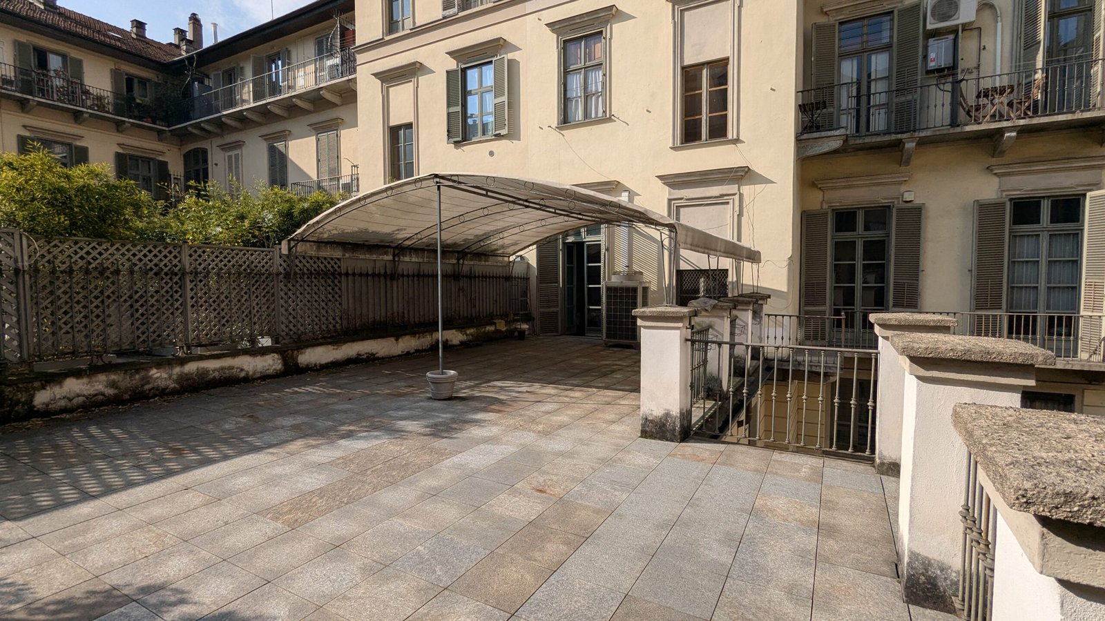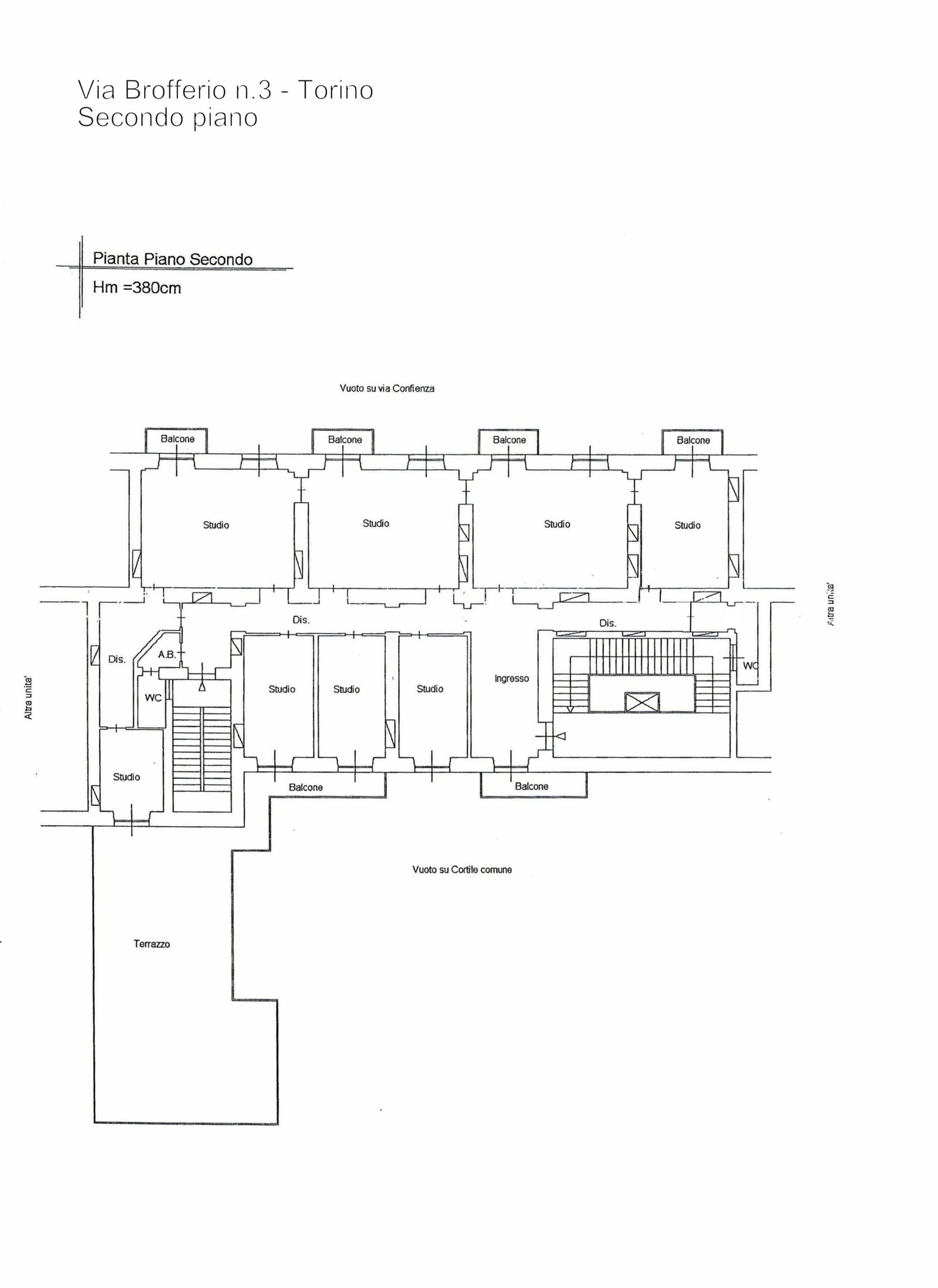 L’ufficio, in origine adibito ad uso abitativo,:è dotato di secondo ingresso di servizio dalla scala del cortile ed è inoltre dotato di un grande terrazzo di circa 80 mq posto all’interno dell’ampia e luminosa area racchiusa nel quadrilatero dei fabbricati d’epoca che affacciano su via Brofferio, via Confienza, via Ponza e corso Re Umberto.
