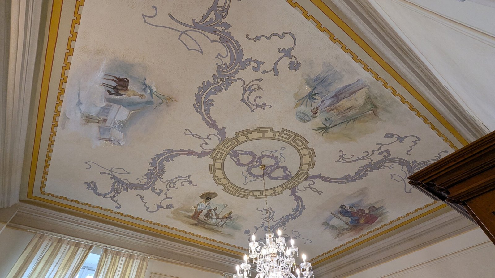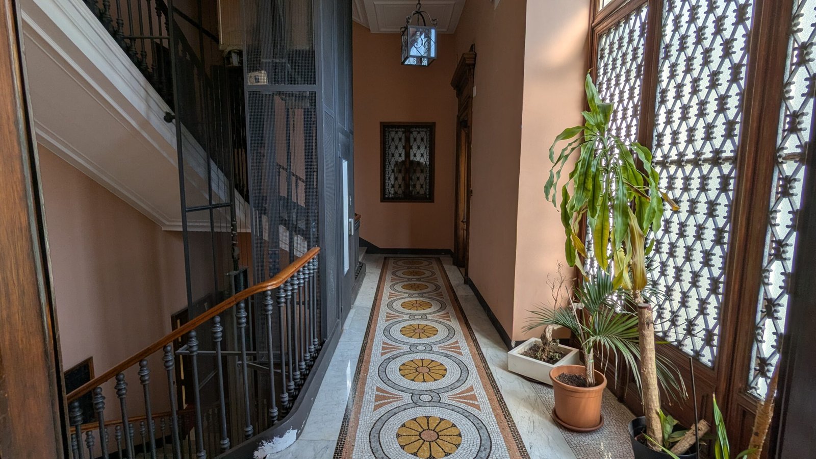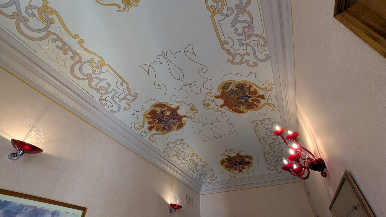 Gli interni sono molto ben conservati e sono composti da un ampio ingresso attualmente adibito a reception, corridoio di disimpegno con soffitto a volta decorato, tre saloni (di circa mq 35 cadauno) ciascuno con camino e palchetti pregiati, quattro camere, cinque balconi, due servizi con antibagno, disimpegno e ulteriore vano per servizi vari con accesso diretto sul terrazzo.